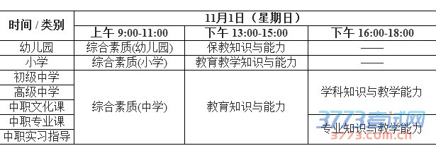 11月1日(星期日)。贵州省2015年下半年中小学教师资格考试笔试所有类别、科目均采用纸笔考试方式进行,每场考试时间为120分钟。