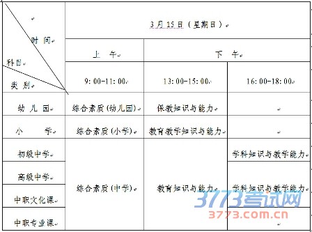 考试日期为2015年3月15日,各科目考试时间为120分钟,全部为纸笔考试,实行答题卡答题形式,使用2B铅笔填涂和签字笔答题两种方式完成答题。具体时间安排如下: