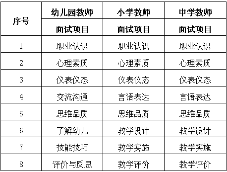 六、面试项目 各学段教师资格考试面试项目具体如下(中职教师面试项目同中学教师):