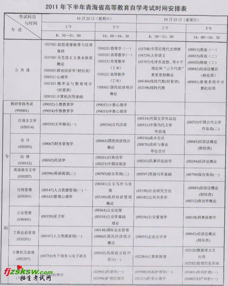 青海2011年下半年教师资格证考试时间安排通知