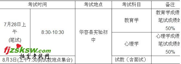 2.考试:①考试办法:考试分笔试和试教(含面试),总分为100分,其中笔试成绩占50\%,试教(含面试)成绩占50\%。根据笔试成绩按招聘计划数1:2的比例确定参加试教人员(如参加试教人员最后一名出现并列名次时,都参加试教),如有专业达不到该比例要求,该专业参加笔试人员均参加试教。②考试科目及考试时间、地点: