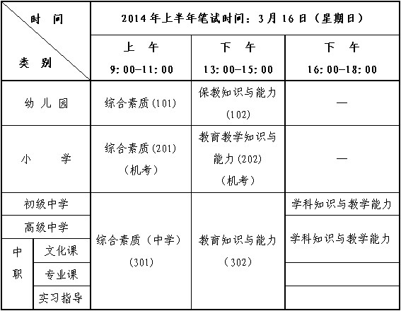 浙江省教育考试院关于举行2014年上半年中小学教师资格考试(笔试)的公告 根据上级统一部署,现将我省2014年上半年中小学教师资格考试笔试工作安排公告如下: 一、 考试日期及安排 2014年上半年笔试考试时间为3月16日,笔试各科考试时间均为120分钟。小学学段各科采用机考方式,其他学段采用纸笔方式考试。