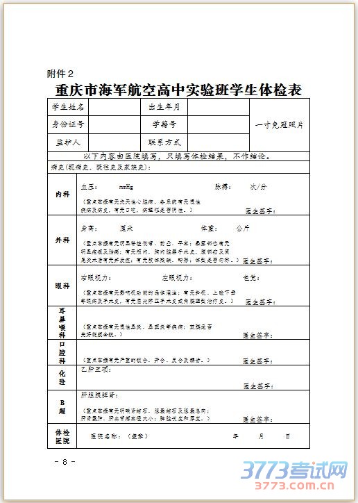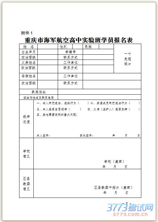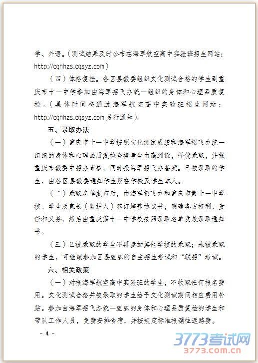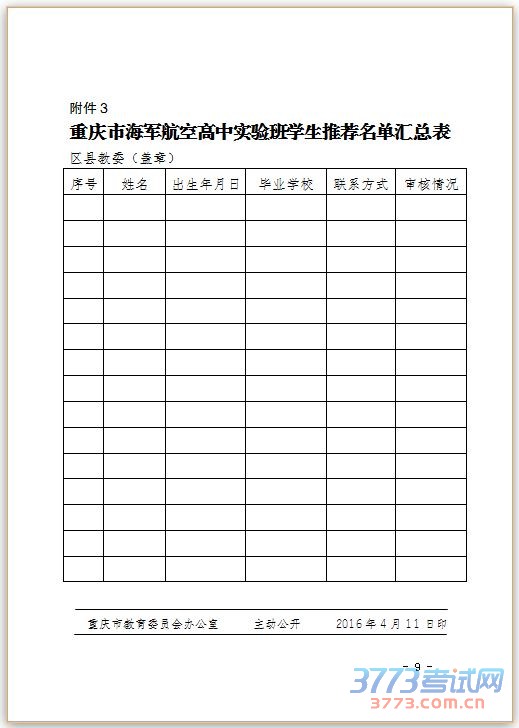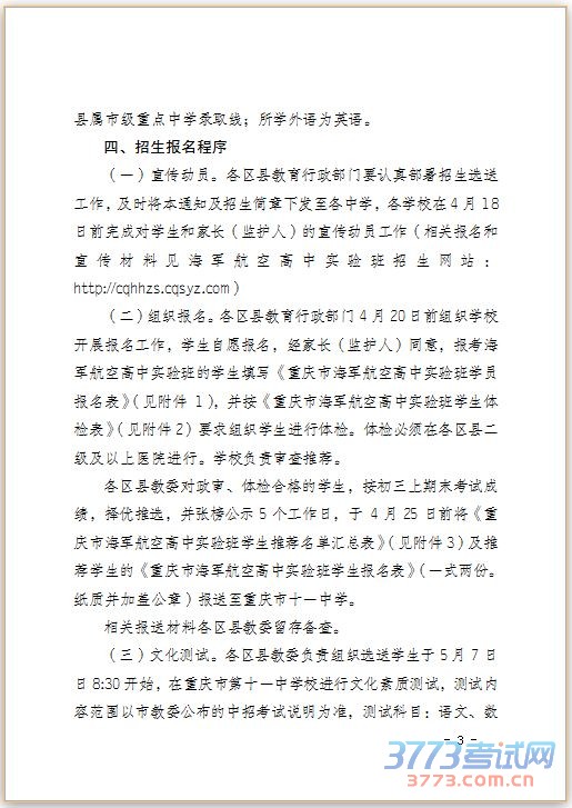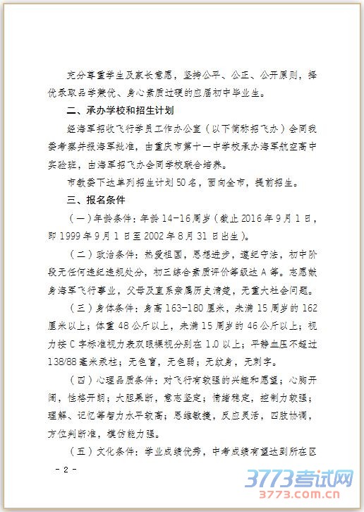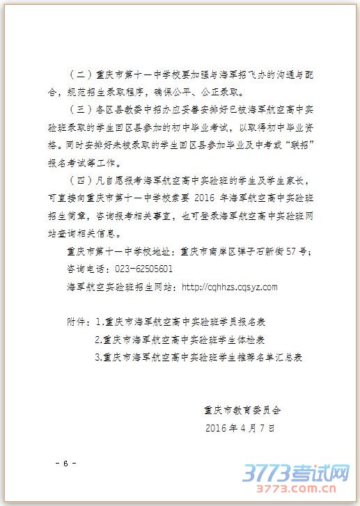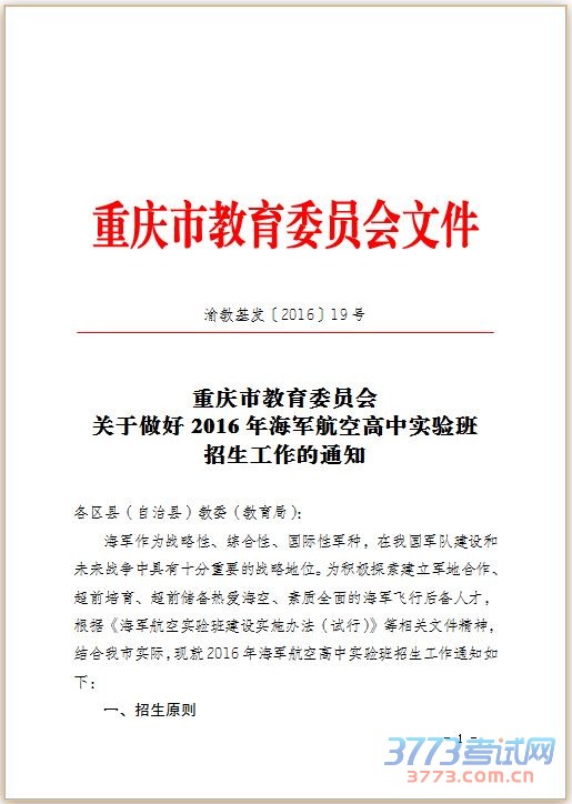 重庆市教育委员会关于做好2016年海军航空高中实验班招生工作的通知 (下载)