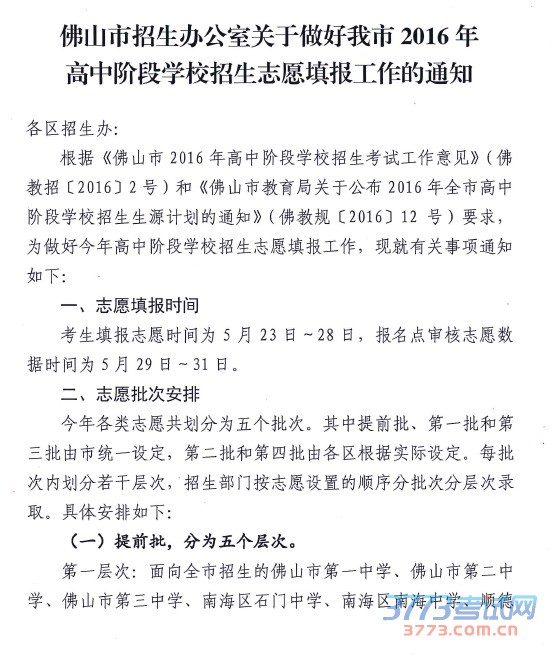 佛山市招生办公室关于做好我市2016年高中阶段学校招生志愿填报工作的通知