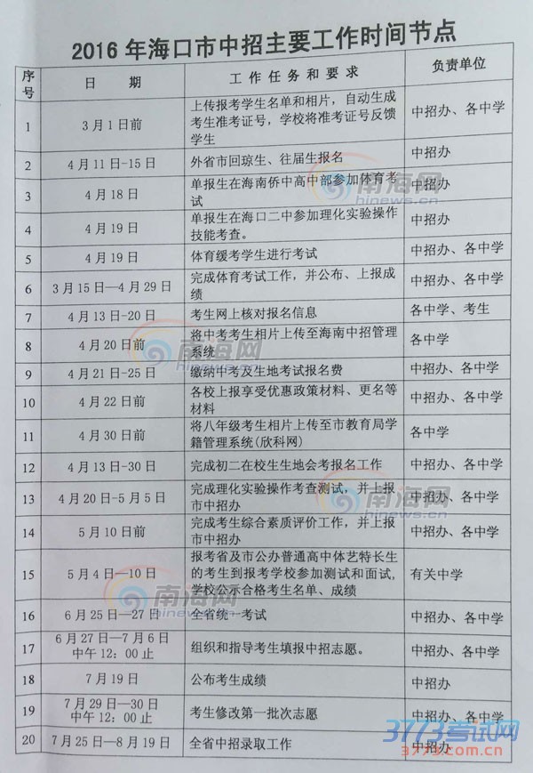 2016年海口市中招主要工作时间节点