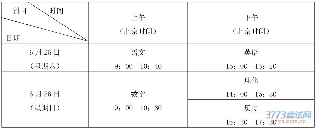体育考试于55-20日进行,英语听说考试于521-22日(星期六、日)进行(继续采用人机对话方式),语文、数学、英语、理化(合卷)、历史考试于625-26日(星期六、日)进行。语文100分钟,数学、理化90分钟,英语80分钟,历史60分钟。具体安排如下: