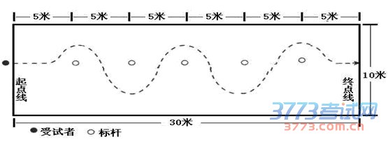 考试规则:受测者站在起点线后准备,听到出发令后开始运球,同时开表,依次S形绕过标志物。受测者和球均过终点线即为完成测试,停表。每人测试一次,以十分之一秒为单位记录测试成绩,过百分之一秒进位。如:7.67秒为7.7秒。登记时,均报出成绩。