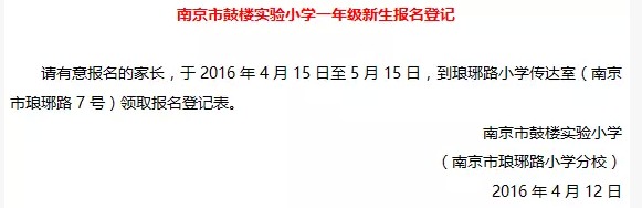 2016南京鼓楼实验小学小学一年级新生报名登记公告