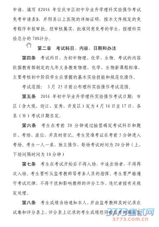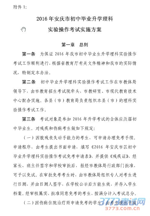 关于印发《2016年安庆市区初中毕业生升学理科实验操作考试实施方案》的通知