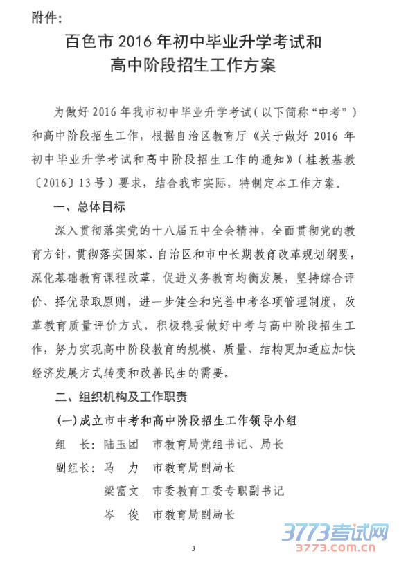 百色市2016年初中毕业升学考试和高中阶段招生工作方案