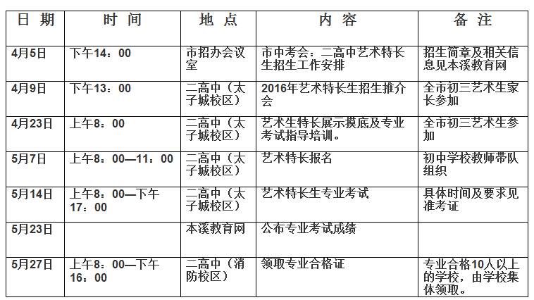 本溪市第二高级中学2016年艺术特长生报考日程安排