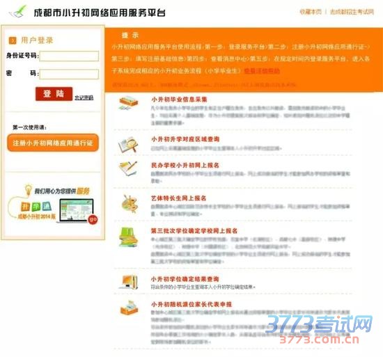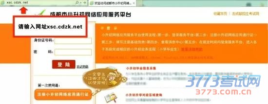 访问网址xsc.cdzk.net进入小升初网络应用服务平台,或通过成都市招考办网站、成都市招生考试网提供的链接登录服务平台。输入用户名(身份证号)和密码进入服务平台。