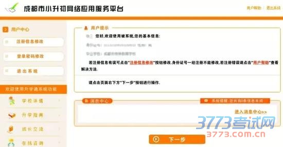 认真阅读消息中心中的信息。阅读信息后,点击“下一步”进入小升初业务功能模块界面。