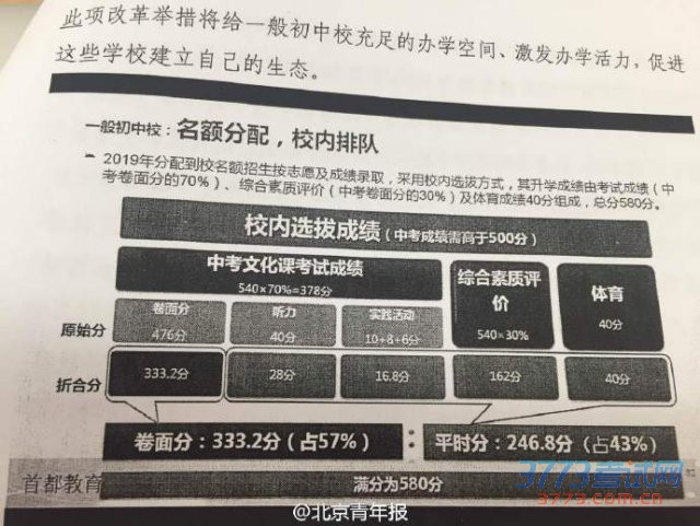 2019 年各校 50% 升入优质高中的机会,什么样的学生可以获得?按照政策要求,学生的中考成绩达到 500 分,且在同一学校具有连续三年学籍,才可参加 50% 优质高中的名额分配。将采取校内选拔的方式,录取成绩仍以中考 580 分计,由中考文化课成绩、初中综合素质评价成绩、体育成绩组成,其中,中考文化课和初中综合素质评价成绩满分 540 分,按 7:3 比例计入,体育满分为 40 分。(北青报记者 林艳 张昆龙)