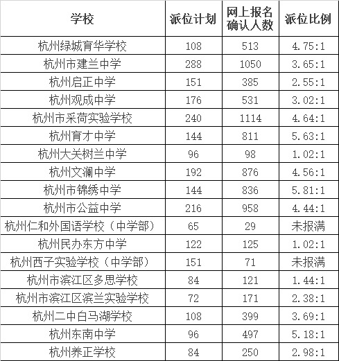 从表格中不难看出,派位比例最高的热门学校是杭州市锦绣中学,达到5.81:1。此外,杭州育才中学、杭州东南中学的派位比也均超过5:1。这三所学校都属于浙江锦绣·育才教育集团。