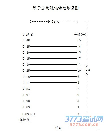 场地器材: 画长为3米,宽为1米的平坦地面,分值和成绩要按评分标准分别清晰画在各分段成绩线的两端(如图3、图4)。
