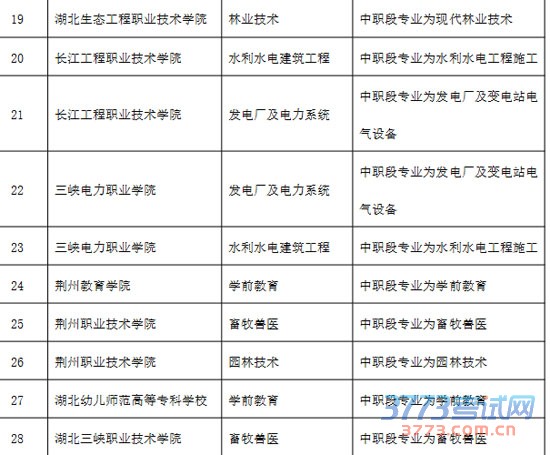 2016年,湖北省可进行五年制高职招生的学校,有湖北职业技术学院、黄冈职业技术学院、襄阳职业技术学院、湖北艺术职业学院、武汉城市职业学院等21所高职院校,合计学前教育、畜牧兽医、园林技术、酿酒技术、水利水电建筑工程、发电厂及电力系统等28个专业。