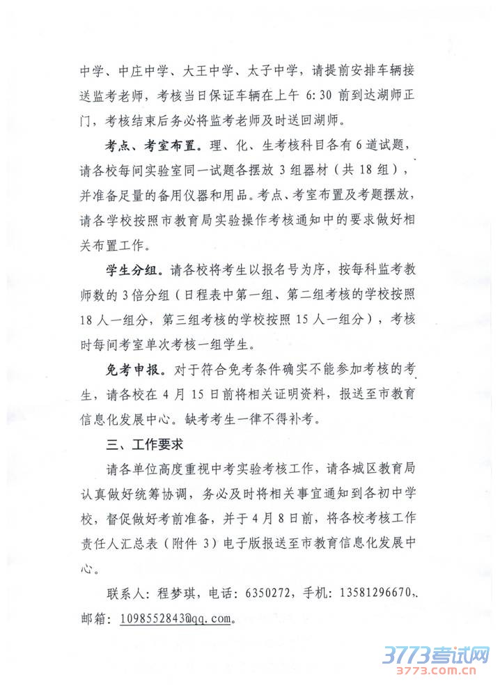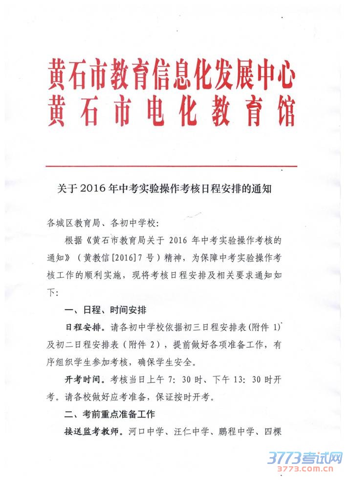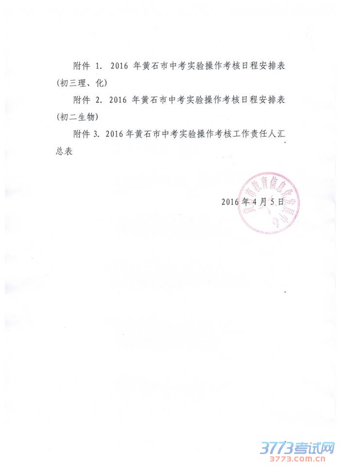 附件:附件1、2016年黄石市中考实验操作考核日程安排表(初三理化).xls附件2、2016年黄石市中考实验操作考核日程安排表(初二生物).xls附件3、2016年黄石市中考实验操作考核工作责任人汇总表.xls
