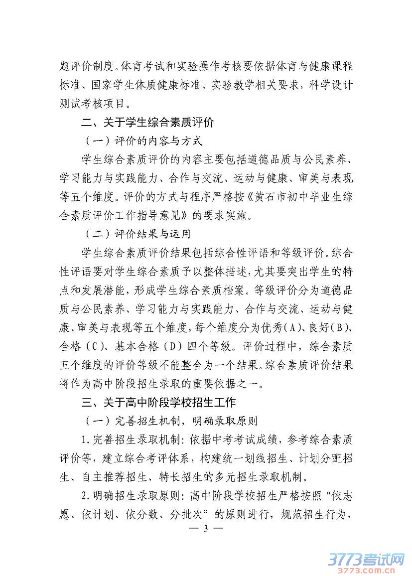 黄石市教育局2016中考方案高中招生实施