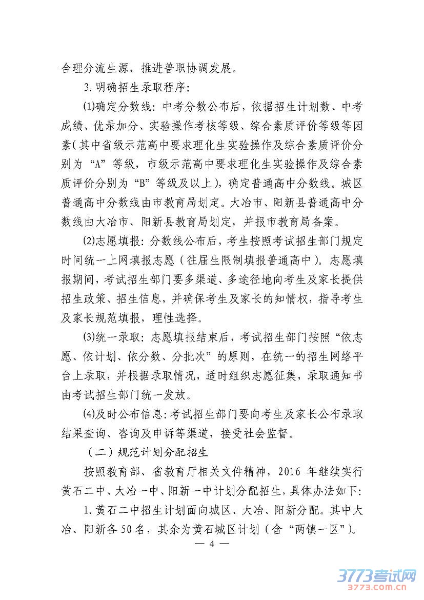 2016黄石中考方案招生工作意见