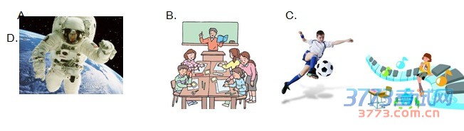 I. 听录音,根据你所听到的顺序选择下面的图画(其中有一副图画为多余选项),并将其代表字母填在答题卡的相应位置(对话读两遍)(共15分,每小题5分)。