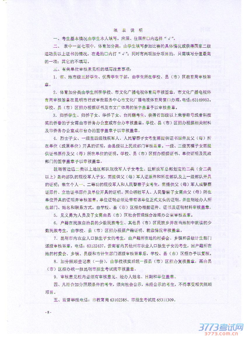 (一)昆明市户口农业人口独生子女考生,由户口所在地的村、乡镇和县级计生部门逐级审核,县级计生部门将加分照顾考生名单汇总,并提供给县(市)区招办。