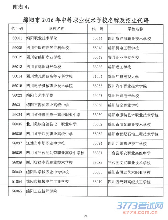 2016绵阳市中职学校名称及招生代码