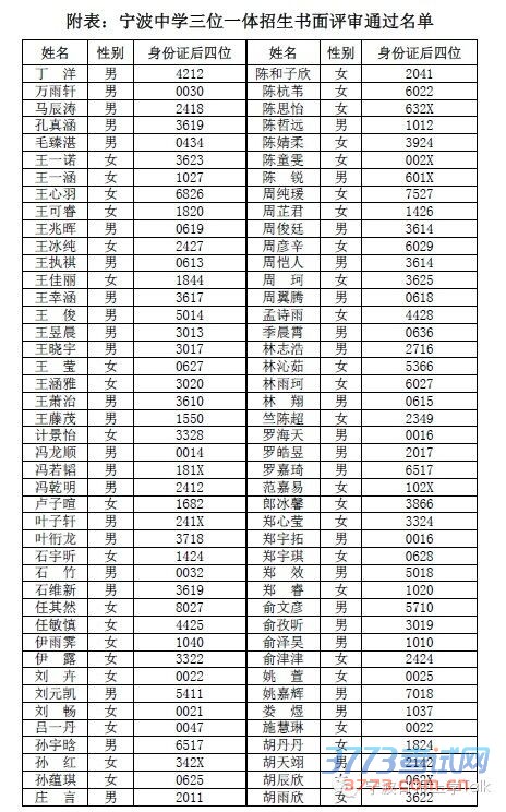 根据市教育局招生文件,宁波中学今年进行“三位一体”综合评价招生,通过书面评审参加宁波中学综合测试的考生共有175人。初审通过的考生名单详见后面附表。