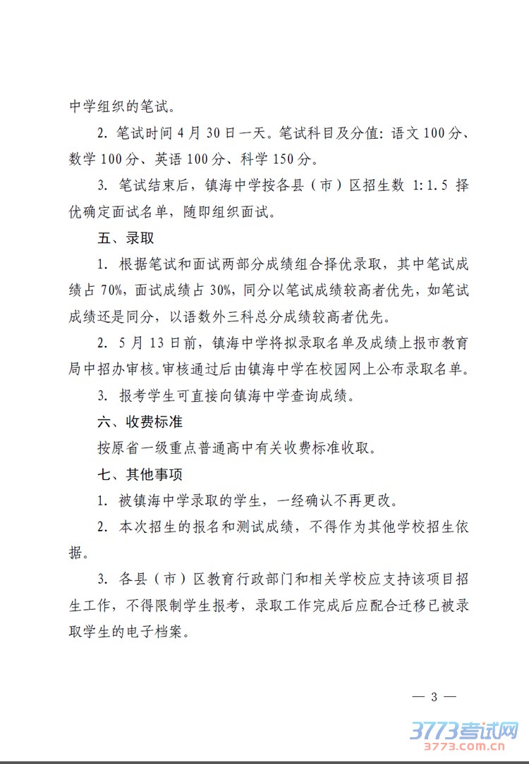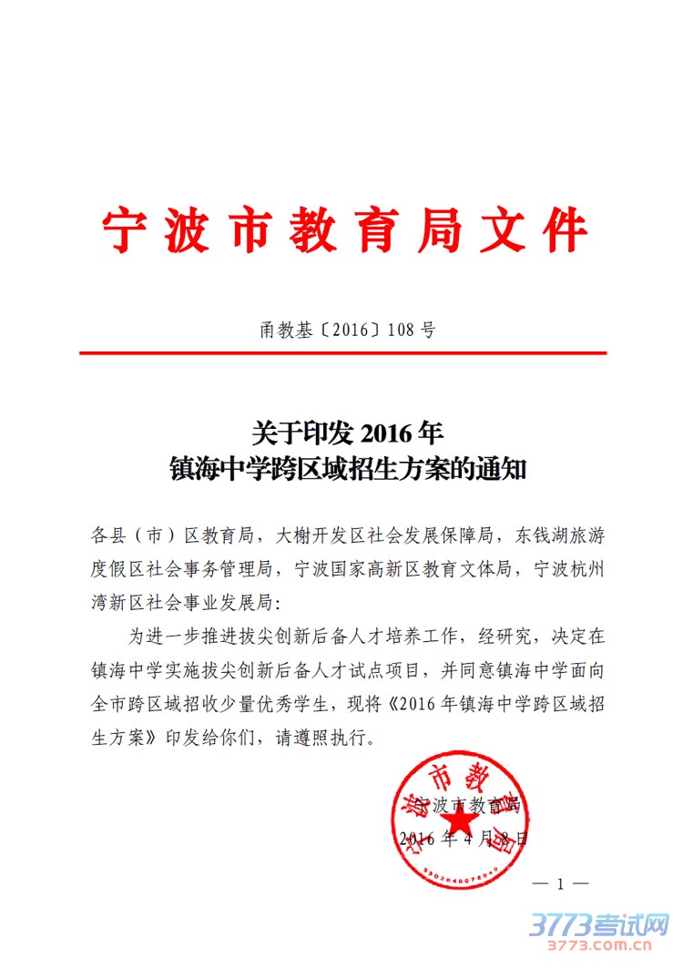 2016宁波镇海中学跨区域招生政策 4月1