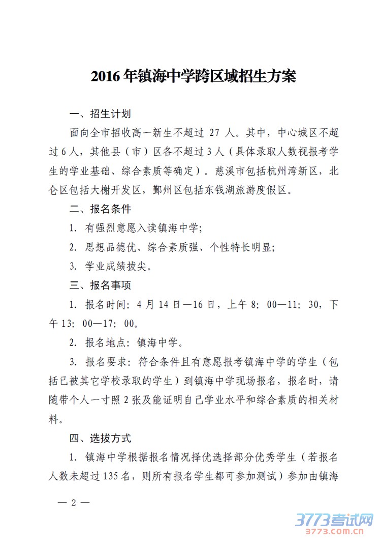 2016宁波镇海中学跨区域招生政策 4月14日开