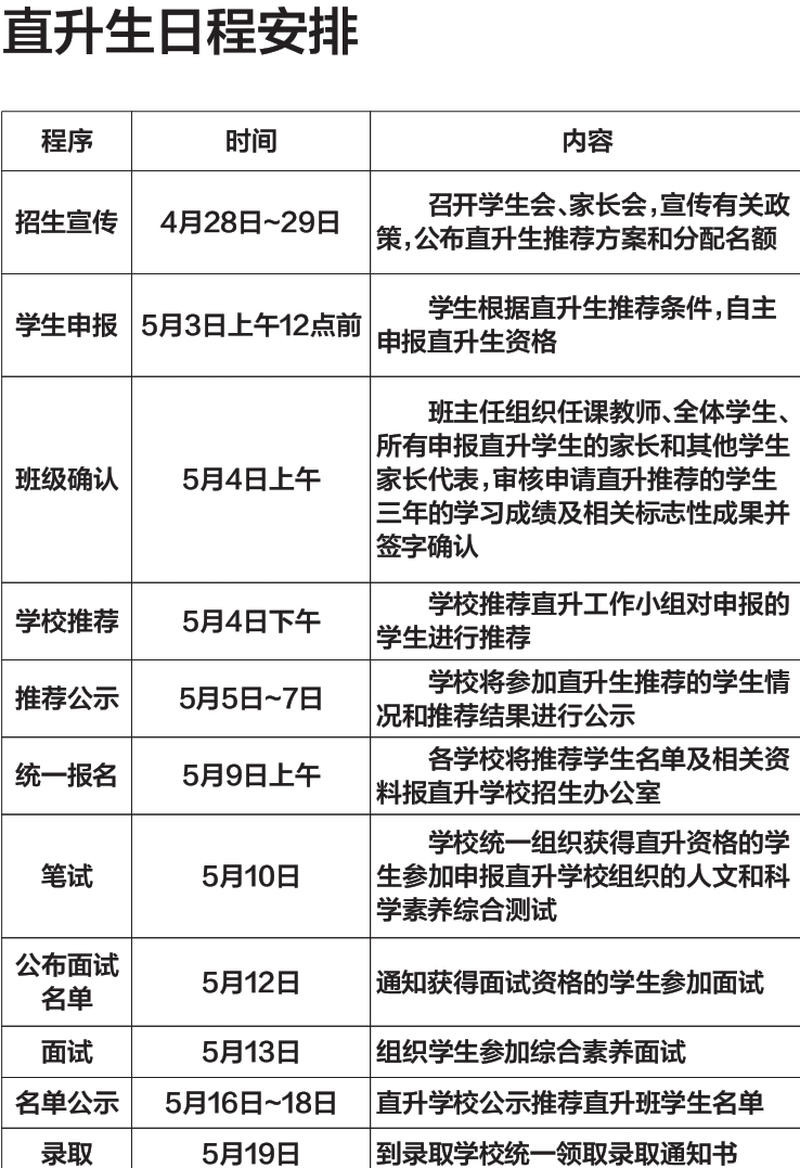 近日,平度市教体局发布了《平度市教育体育局于印发2016年优秀初中毕业生推荐直升工作方案的通知》,根据通知要求,平度一中、平度九中各招100名直升生,开发区高中、华侨中学各招180名直升生。5月10日各高中学校统一组织获得直升资格的学生参加申报直升学校组织的人文和科学素养综合测试,5月13日,各高中学校组织学生参加综合素养面试,5月16日~18日,各高中学校公示推荐直升班学生名单。以上直升生录取后学生单独编班。 5月10日笔试,笔试内容各学校自主确定 记者了解到,报名参加直升生的学生都需要参加5月10日各高中学校组织的笔试。平度一中笔试语文科目时间为120分钟,分值120分,其中含20分古诗文默写;数学90分钟,120分;英语90分钟,120分;理科综合90分钟,90分,包括物理(50分)、化学(30分)、生物(10分);文科综合60分钟,50分,包括历史(25分)、政治(10分)、地理(15分)。命题紧密结合学生生活和社会现实生活,着重考查学生的基本素养和运用知识分析解决问题的能力以及创新思维能力,考试全部采用闭卷方式。根据笔试成绩划分为A(20%)、B(40%)、C(35%)、D(5%)四个等次。 平度九中在笔试科目上的安排为:语文、数学、英语每科考试时间为90分钟,满分每科为120分;理科综合考试时间为120分钟,满分为120分,其中物理65分,化学35分,生物20分;文科综合考试时间为60分钟,满分为70分,其中历史40分,政治15分,地理15分。考查内容:数学、物理、化学、语文、英语考查学科的基础知识和基本技能。命题突出能力立意,紧密联系学生的生活、学习实际,注重考查学生运用基础知识和基本技能发现问题、分析问题、解决问题的能力以及收集与处理信息的能力;政治、历史、地理、生物注重考生综合能力的考查。笔试成绩分为A(20%)、B(40%)、C(35%)、D(5%)四个等次。 开发区高中、华侨中学笔试语文科目时间为120分钟,分值100分;数学90分钟,100分;英语90分钟,100分;理综90分钟,满分150分,其中物理80分,化学50分,生物20分;文综60分钟,满分100分,其中政治20分,历史40分,地理40分。命题突出能力立意,紧密联系学生的生活、学习实际,注重考查学生运用基础知识和基本技能发现问题、分析问题、解决问题的能力以及收集与处理信息的能力,政治、历史、地理、生物注重能力测试,不考死记硬背题目。试题难度系数与中考题相当。考生笔试成绩语文、数学、英语以实得分计入总成绩,理综、文综以实得分的60% 计入总成绩。笔试总成绩分为A(20%)、B(40%)、C(35%)、D(5%)四个等次。 5月13日面试,按照1:1.2的比例确定面试名单 记者了解到,报名参加直升生的学生都需要参加5月13日各高中学校组织的面试。平度一中面试根据笔试成绩,按照1:1.2的比例,确定面试名单并予以公示。学生参加面试答辩,考查学生的语言表达能力、辩证思维能力、创新和实践能力、人生价值观与道德素养等方面。面试成绩为 100分,划分为A(20%)、B(40%)、C(35%)、D(5%)四个等次。平度九中综合素养面试根据笔试成绩,按计划录取人数的1:1.2确定面试名单,通过校园网和校内张榜公示。面试主要考查学生的综合素养。内容涉及科技与信息素养、音体美素养、人文与社会领域等,侧重情感态度价值观、语言表达能力、逻辑思维能力和实践能力等方面的考查。学生需按规定的程序、在规定时间内完成面试。面试成绩满分为100分,分为A(20%)、B(40%)、C(35%)、D(5%)四个等次。 开发区高中、华侨中学面试根据笔试成绩,按计划录取人数的1:1.2确定面试名单,通过校园网和校内张榜公示。面试主要考查学生的综合素养。内容涉及科技与信息素养、音体美素养、人文与社会领域等,侧重情感态度价值观、语言表达能力、逻辑思维能力和实践能力等方面的考查。学生需按规定的程序、在规定时间内完成面试。面试成绩满分为100分,分为A(20%)、B(40%)、C(35%)、D(5%)四个等次。 记者 邬明洋 本报通讯员 王晓娟