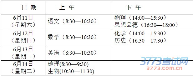 (一)文化课考试。定于6月11日—14日进行,时间及科目安排如下表: