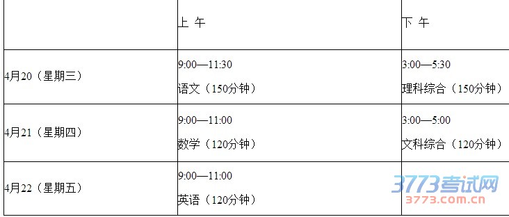 上 午下 午4月20(星期三)9:00—11:30语文(150分钟)3:00—5:30理科综合(150分钟)4月21(星期四)9:00—11:00数学(120分钟)3:00—5:00文科综合(120分钟)4月22(星期五)9:00—11:00英语(120分钟)