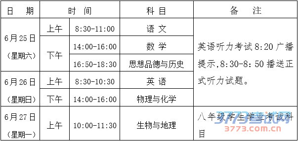 (四)考试时间:全省初中毕业学业考试时间为2016年6月25日至26日,八年级学生生物与地理学业考试时间为6月27日。各科目具体考试时间(北京时间)如下: