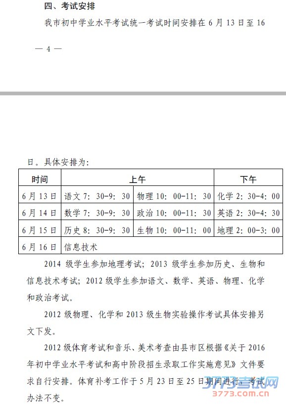 我市初中学业水平考试统一考试时间安排在6 月13 日至16日。具体安排为: