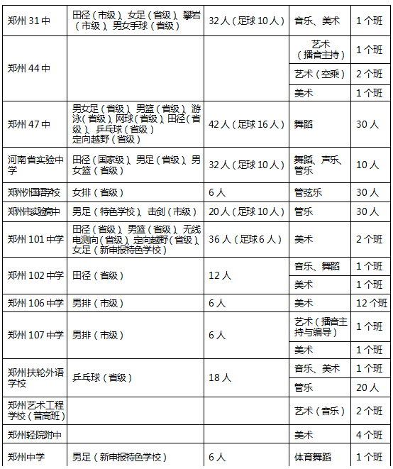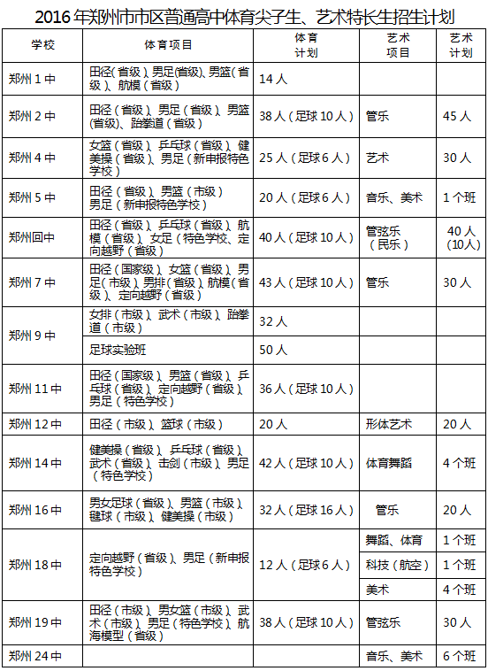 2016年郑州市市区普通高中体育尖子生、艺术特长生招生计划见下表!