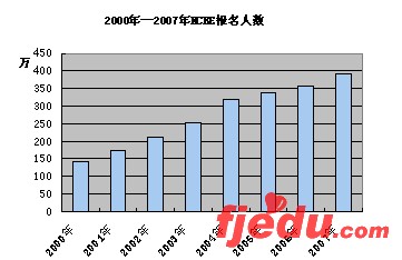 自1994年开考以来,NCRE适应了市场经济发展的需要,考试持续发展,考生人数逐年递增,至2007年底,累计考生人数超过2450万,累计获证人数达890万。