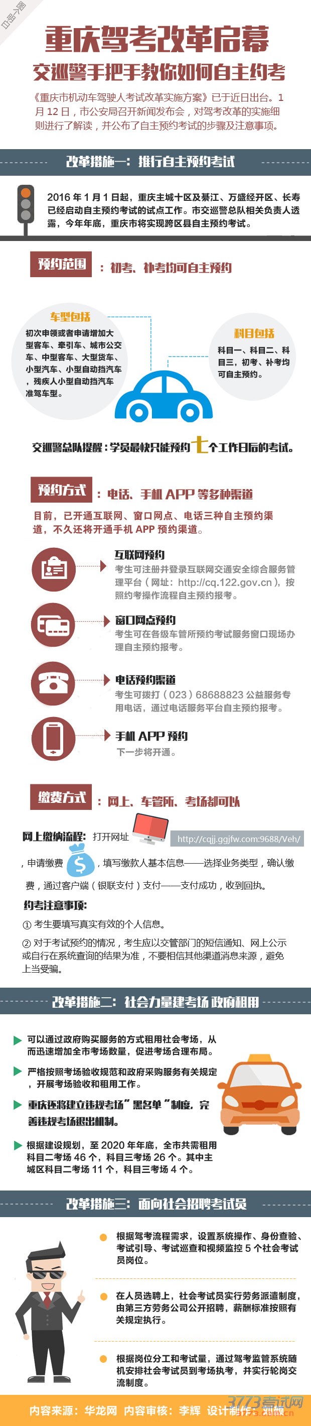 ①互联网预约。考生可注册并登录互联网交通安全综合服务管理平台(网址:http://cq.122.gov.cn),按照约考操作流程自主预约报考。