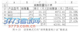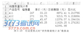 【例4-6】 现有工作表中的“销售数量统计表”数据表如图4—20所示,设置如下单元格格式:合并Al:El单元格区域且内容水平居中,合并A7:C7单元格区域且内容靠右;A2:A6单元格区域设置图案颜色为“白色,背景1,深色35%”,样式为“25%灰色”;E3:E6单元格区域设置数字分类为百分比,保留小数点后两位;Al:E7单元格区域设置样式为黑色细单实线的内部和外部边框。