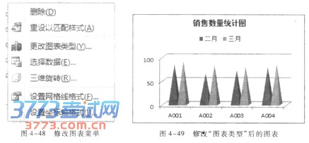 单击图表绘图区,选择图4—48所示菜单中的“更改图表类型”命令,修改图表类型为“簇状棱锥图”,结果如图4-49所示。也可以利用“图表工具”选项卡下的“类型”命令组中的“更改图表类型”命令来完成。