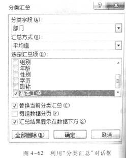 (2)选择“数据”选项卡下的“分级显示”命令组的“分类汇总”命令,在弹出的“分类汇总”对话框中,选择分类字段为“部门”,汇总方式为“平均值”,选定汇总项为“基本工资”,选中“汇总结果显示在数据下方”,如图4—62所示,单击“确定”按钮即可