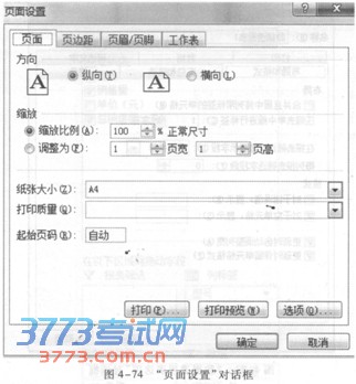 选择“页面布局”选项卡下的“页面设置”命令组中的命令或单击“页面设置”命令组右下角 的小按钮,利用弹出的“页面设置”对话框可以进行页面的打印方向、缩放比例、纸张大小以及打印质量的设置,如图4—74所示。