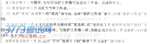 (3)选择“审阅”选项卡下的“更改”命令组中的“保护工作表”命令,完成工作表的保护。 选中该单元格,利用“审阅”选项卡“更改”命令组的“取消保护工作表”命令,可撤销保护公式。利用“审阅”选项卡“更改”命令组的“允许用户编辑的区域”命令,可以设置允许用户编辑的单元格区域,让不同的用户拥有不同编辑工作表的权限,达到保护数据的目的。利用“文件”选项卡下右侧的“保护工作簿”选项,可以实现将工作簿标记为最终状态、用密码行加密、保护当前工作表、保护工作表结构等操作。