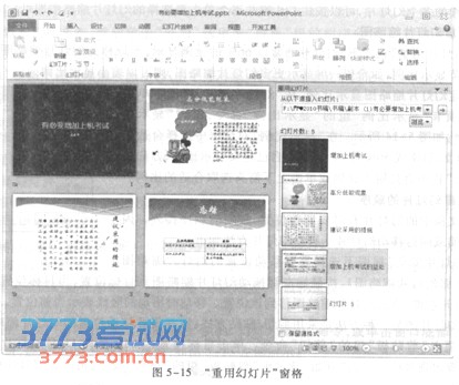 在“幻灯片浏览”视图下能插入一张新幻灯片,也能插入属于另一演示文稿的一张或多张幻灯片。 1)插入一张新幻灯片 ①在“幻灯片浏览”视图下单击目标位置,该位置出现竖线。 ②单击“开始”选项卡“幻灯片”组的“新建幻灯片”命令,在出现的幻灯片版式列表中选择一种版式后,该位置出现所选版式的新幻灯片。 2)插入来自其他演示文稿文件的幻灯片 如果需要插入其他演示文稿的幻灯片,可以采用重用幻灯片功能。 ①在“幻灯片浏览”视图下单击当前演示文稿的目标插入位置,该位置出现竖线。 ②单击“开始”选项卡“幻灯片”组的“新建幻灯片”命令,在出现的列表中选择“重用幻灯片”命令。右侧出现“重用幻灯片”窗格。 ③单击“重用幻灯片”窗格的“浏览”按钮,并选择“浏览文件”命令。在出现的“浏览”对话框中选择要插入幻灯片所属的演示文稿并单击“打开”按钮。此时“重用幻灯片”窗格中出现该演示文稿的全部幻灯片。如图5一l5所示。 ④单击“重用幻灯片”窗格中某幻灯片,则该幻灯片被插入到当前演示文稿的插入位置。 若该插入位置需要插入多张幻灯片,在“重用幻灯片”窗格依次单击这些幻灯片即可。若某幻灯片要插入到另一位置,则先在当前演示文稿确定插入位置,然后在“重用幻灯片”窗格单击目标幻灯片,则该幻灯片被插入到指定的新位置。