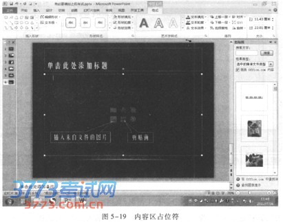 以插入剪贴画为例说明占位符方式。插入新幻灯片并选择“标题和内容”版式(或其他具有内容区占位符的版式),如图5—19所示。单击内容区“剪贴画”图标,右侧出现“剪贴画”窗格,搜索剪贴画并插入即可(具体参见以下内容)。