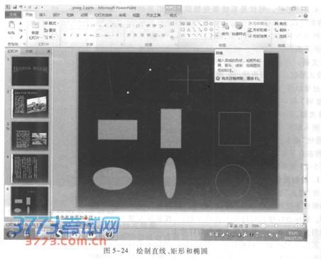 ①在“开始”选项卡“绘图”组单击“形状”列表右下角“其他”按钮,出现各类形状的列表。在形状列表中单击“矩形”(“椭圆”)命令。鼠标指针呈十字形。 ②鼠标指针移到幻灯片上某点,按鼠标左键可拖出一个矩形(椭圆)。向不同方向拖动,绘翻的矩形(椭圆)也不同。如图5-24所示。 ③鼠标指针移到矩形(椭圆)周围的控点上,鼠标指针变成双向箭头,拖动控点,就可以改变矩形(椭圆)的大小和形状。拖动绿色控点,可以旋转矩形(椭圆)。 若按shift键拖动鼠标可以画出标准正方形(标准正圆)。 3.在形状中添加文本