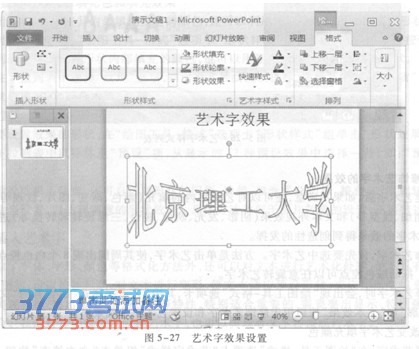 2.修饰艺术宇的效果 创建艺术字后,如果不满意,还可以对艺术字内的填充(颜色、渐变、图片、纹理等)、轮廓线 (颜色、粗细、线型等)和文本外观效果(阴影、发光、映像、棱台、三维旋转和转换等)进行修饰处理,使艺术字的效果得到创造性的发挥。 修饰艺术字,首先要选中艺术字。方法是单击艺术字,使其周围出现8个白色控点和一个绿 色控点。拖动绿色控点可以任意旋转艺术字。 选择艺术字时,会出现“绘图工具一格式”选项卡,其中“艺术字样式”组含有的“文本填充”、“文本轮廓”和“文本效果”按钮用于修饰艺术字和设置艺术字外观效果。 1)改变艺术字填充颜色 , 选择艺术字,在“绘图工具一格式”选项卡“艺术字样式”组单击“文本填充”按钮,在出现的下拉列表中选择一种颜色,则艺术字内部用该颜色填充。也可以选择用渐变、图片或纹理填充艺 术字。选择列表中的“渐变”命令,在出现的渐变列表中选择一种变体渐变(如“中心辐射”)。选择列表中的“图片”命令,则出现“插入图片”对话框,选择图片后用该图片填充艺术字。选择列表中的“纹理”命令,则出现各种纹理列表,从中选择一种(如“画布”)即可用该纹理填充艺术字。 2)改变艺术字轮廓 为美化艺术字,可以改变艺术字轮廓线的颜色、粗细和线型。选择艺术字,然后在“绘图工具一格式”选项卡“艺术字样式”组单击“文本轮廓”按钮,出现下拉列表,可以选择一种颜色作为艺术字轮廓线颜色。 在下拉列表中选择“粗细”项,出现各种尺寸的线条列表,选择一种(如:l.5磅),则艺术字轮廓采用该尺寸线条。 在下拉列表中选择“虚线”项,可以选择线型(如:“短划线”),则艺术字轮廓采用该线型。 3)改变艺术字的效果 如果对当前艺术字效果不满意,可以以阴影、发光、映像、棱台、三维旋转和转换等方式进行修饰,其中转换可以使艺术字变形为各种弯曲形式,增加艺术感。单击选中艺术字,在“绘图工具一格式”选项卡“艺术字样式”组单击“文本效果”按钮,出现下拉列表,选择其中的各种效果(阴影、发光、映像、棱台、三维旋转和转换)进行设置。以“转换”为例,鼠标移至“转换”项,出现转换方式列表,选择其中一种转换方式,如“弯曲一朝鲜鼓”,艺术 字立即转换成“朝鲜鼓”形式,拖动其中的紫色控点可改变变形幅度。如图5—27所示。