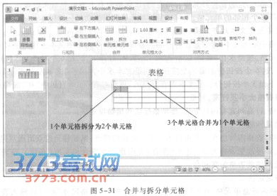 合并单元格是指将若干相邻单元格合并为一个单元格,合并后的单元格宽度(高度)是被合 并的几个单元格宽度(高度)之和。而拆分单元格是指将一仑单元格拆分为多个单元格。合并单元格的方法:选择相邻要合并的所有单元格(如:同一行相邻3个单元格),单击“表格工具一布局”选项卡“合并”组的“合并单元格”按钮,则所选单元格合并为1个大单元格。如图 5—31所示。