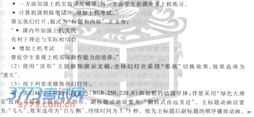 第二张幻灯片的版式改为“两栏内容”,正文在右边,右侧内容区插入剪贴画(computers),在指定位置(水平:5.8厘米,度量依据:左上角;垂直:6.6厘米,度量依据:左上角)插入“云形标注”(内容文本为:“如何存盘?”)。“云形标注”动画设置为:“浮人”,方向为“上浮”。