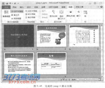 单击快速工具栏的“保存”按钮,并以yswg一1.pptx保存。完成后的演示文稿如图5—45所示。